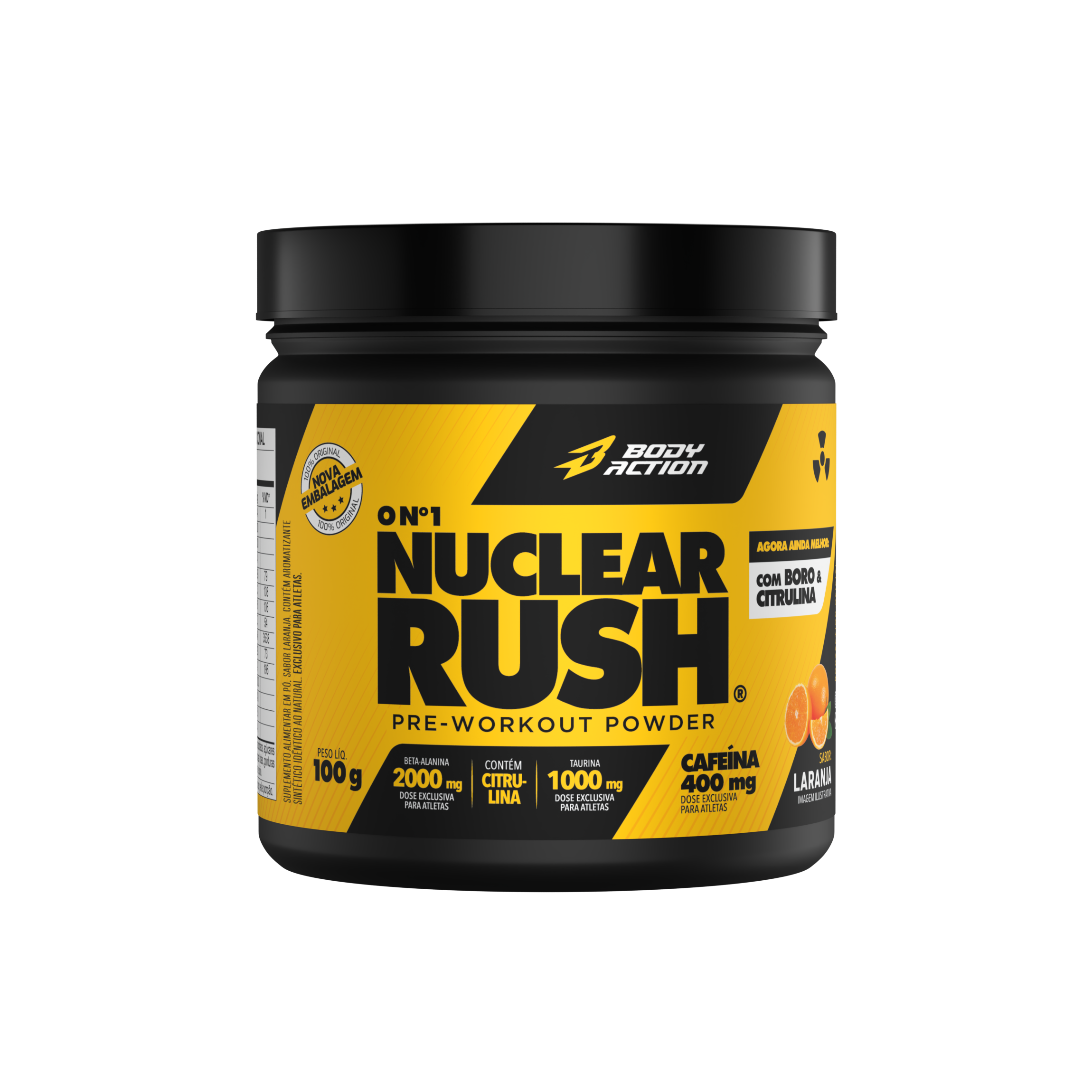 O Nuclear Rush Bodyaction é um pré-treino de alta performance, desenvolvido para maximizar energia, resistência e foco. Sua fórmula avançada combina Beta-Alanina, Taurina, L-Arginina e Cafeína Anidra, proporcionando explosão de força, retardando a fadiga muscular e melhorando a performance durante os treinos. Além disso, o suplemento conta com um complexo de vitaminas do complexo B, Coenzima Q10 e Boro, oferecendo suporte metabólico e recuperação muscular eficiente.